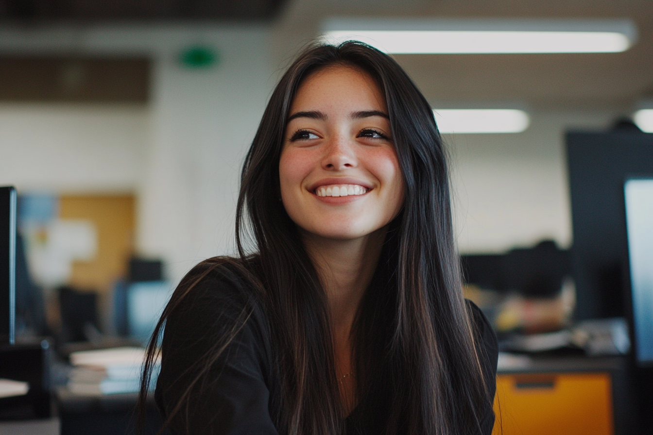 Una mujer sonriente en una oficina | Fuente: Midjourney